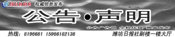 ◆张秀云丢失身份证,号码:370786196103180622,特此声明。 ◆李媛媛丢失身份证,号码:370786198608100666,特此声明。 ◆杨亚蒂丢失身份证,号码:370705197807070022,特此声明。 ◆官效山丢失身份证,号码:37070219811022543X,发证日期:2006年11月16日,特此声明。 ◆王时强丢失执业医师证,证号:200537110370723198005043978,声明作废。 ◆范天俊丢失电工证,证号:T37070419651203041X,发证日期:2011年6月29日,声明作废。 ◆潍坊恒联美林生活用纸有限公司丢失中华人民共和国海关进出口货物收发货人报关注册登记证书,编号:3707932769,声明作废。 ◆潍坊市昌良建筑防水材料厂丢失开户许可证,核准号:J4584000102501,声明作废。 ◆潍坊富科汽车修理厂丢失增值税防伪税控IC卡一张,卡号:09111010018427,声明作废。 ◆昌乐富美塑胶包装材料有限公司丢失中华人民共和国外商投资企业批准证书,批准号:商外资鲁府潍字【2002】0695号,声明作废。 债权转让公告 我行拟于2011年8月23日公开处置李林明等9笔债权,请有意者与我行联系。 联系电话:0536-3265685 联系人:王先生 山东青州农村商业银行股份有限公司 2011年8月15日