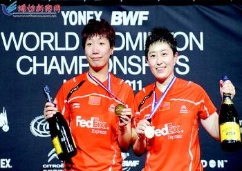 | 8月14日,2011羽毛球世锦赛在伦敦结束了女双比赛的争夺,在一场中国队的女双内战中,王晓理/于洋发挥超强实力,2:0战胜队友,获得世锦赛女双金牌。并使得中国队实现了世锦赛女双10连冠。 (新华社发) |