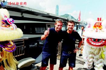 | ◤8月15日,瑞士著名探险家Raphael Domjan(左)及船长 Erwann Le Rouzic登陆上岸。 |