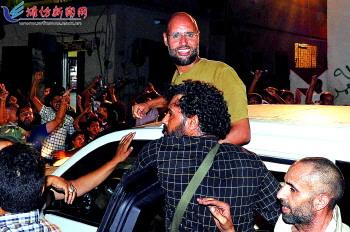 | 8月23日,卡扎菲次子赛义夫出现在的黎波里街头并发表讲话。(新华社发) |