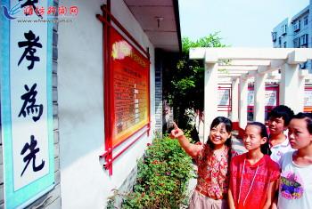 8月23日,中学生和社区工作人员在参观社区文化展。暑假期间,奎文区东关街道新华社区在社区主要街道张贴文化展板,包含有礼义仁智信及二十四孝故事等,让中小学生在假期里通过社区实践活动,加深对传统美德的理解。 记者王立军摄