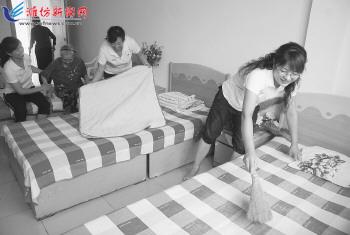奎文区东关街道苇湾社区关注社区养老事业,成立专门的社区关爱老人志愿者队伍,不定期来到社区老年公寓、日托所,对行动不便的空巢老人和孤寡老人提供志愿服务,帮助他们整理床铺,换洗衣物、陪他们聊天等,受到老人们的欢迎。图为社区志愿者在帮助老人整理床铺。 记者王立军摄