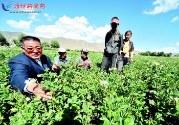 ◥9月4日,在西藏自治区南木林县土豆标准化生产基地,来自寿光市的农艺师刘国新(左一)在指导当地种植户进行田间管理。西藏自治区南木林县为我市对口支援县,土豆种植是当地的传统产业。近年来,当地种植户在我市农业专家的指导下,改变传统粗放式管理模式,实行高垄栽培、地膜覆盖等精细化管理方法和规模化种植,土豆产量与质量大幅提高。目前,南木林县土豆种植面积达4万亩,年产优质土豆1亿多公斤,实现收入近1.3亿元。 记者曹亮华摄