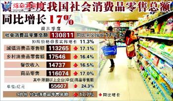 据新华社北京10月18日电 (记者刘铮 张翅)国家统计局18日宣布,初步测算显示,前三季度中国国内生产总值为320692亿元,按可比价格计算,同比增长9.4%。 分季度看,一季度中国国内生产总值同比增长9.7%,二季度增长9.5%,三季度增长9.1%。分产业看,第一产业增加值30340亿元,增长3.8%;第二产业增加值154795亿元,增长10.8%;第三产业增加值135557亿元,增长9.0%。从环比看,三季度国内生产总值增长2.3%。 国家统计局新闻发言人盛来运在国务院新闻办公室举行的新闻发布会上说,前三季度国民经济保持平稳较快发展,运行总体良好,继续朝着宏观调控预期方向发展。 农业生产形势良好,工业生产平稳增长。全国夏粮产量为12627万吨,比上年增长2.5%。早稻产量3276万吨,比上年增长4.5%。秋粮可望再获丰收,全年粮食产量将会超过去年。前三季度,猪牛羊禽肉产量5453万吨,同比增长0.2%,其中猪肉产量3568万吨,下降0.6%。前三季度,全国规模以上工业增加值同比增长14.2%,比上半年回落0.1个百分点。9月份,规模以上工业增加值同比增长13.8%,环比增长1.2%。 固定资产投资保持较快增长,市场销售平稳。前三季度,全国固定资产投资(不含农户)为212274亿元,同比增长24.9%(扣除价格因素实际增长16.9%),比上半年回落0.7个百分点;全国房地产开发投资44225亿元,同比增长32.0%,比上半年回落0.9个百分点;社会消费品零售总额130811亿元,同比增长17.0%(实际增长11.3%),比上半年加快0.2个百分点。9月份,社会消费品零售总额同比增长17.7%(实际增长11.0%),环比增长1.35%。 盛来运表示,当前,经济发展面临的国内外环境更趋复杂,不稳定、不确定因素有所增加。下阶段宏观调控既要保持政策的连续性、稳定性,又要增强政策的前瞻性、针对性和灵活性,进一步处理好保持经济平稳较快发展、调整经济结构和管理通胀预期的关系,加大改革创新力度,加快经济结构调整和发展方式转变,更加重视保障和改善民生,促进经济又好又快发展。