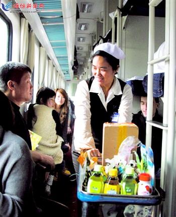| 2011年2月8日,青岛至哈尔滨的K702次列车上,一名乘务员在卖水。 马成军摄 |