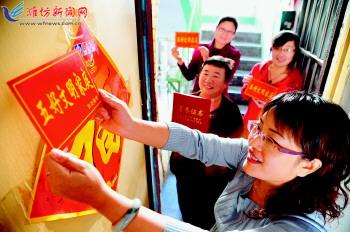 10月17日,苇湾社区工作人员在为社区居民郭秀会发放“文明户”光荣牌。奎文区东关街道苇湾社区结合社区文明创建,在社区居民中开展了争先创优积极分子、争做文明居民、争做五好家庭等活动,居民积极参与,参与和谐社区建设的积极性得到大幅提高。 记者王立军摄