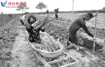 10月22日,固堤街道山药种植户正在出山药。日前,寒亭区固堤街道的山药种植户们迎来了山药的集中收获期,吸引了青岛、寿光等大量外地客商前往收购。据街道有关人员介绍,今年固堤山药收成好且价格高,按照目前市场价格来估算,亩产效益近万元,每亩可增收6000余元。 记者王立军摄