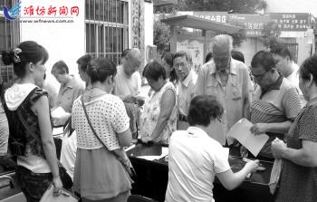 奎文区积极构建城乡一体化社会保险体系,扎实推进新型农村养老保险和城镇居民养老保险工作并轨,促进经济发展成果让人民共享。图为工作人员在苇湾社区现场办理城镇居民养老保险手续。 卜祥欣摄