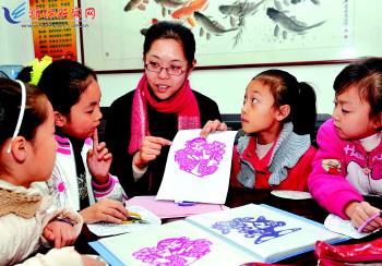 11月12日,奎文区东关街道民生街社区志愿者在教小朋友学剪纸。为满足社区居民不断增长的文化需求,该社区建起了由社区文化骨干组成的社区文化志愿者服务队,在开展丰富多彩的社区文化活动的同时,利用社区居民学校开办舞蹈、书画、美术、剪纸等课程,培养居民特别是孩子们的业余爱好,受到居民的普遍欢迎。 记者王晓光摄