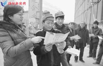 12月19日,潍城区法律援助中心律师来到西关街道安顺苑建筑工地向农民工发放法律知识便民手册。当日,潍城区法律援助中心的律师服务团深入建筑工地,开展了农民工维权进工地活动,通过法律咨询、现场受理农民工法律援助申请、免费为农民工维权讨工资,向农民工发放法律知识便民手册等方式,积极引导农民工通过法律途径保护自身权益,受到广大农民工的欢迎。 见习记者王乐摄