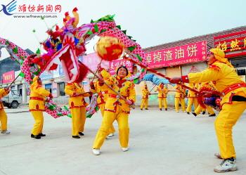 元旦期间,潍城区军埠口综合项目区各村的舞龙队走上街头为村民进行舞龙表演,为人们送上新年祝福,迎接龙年的到来。