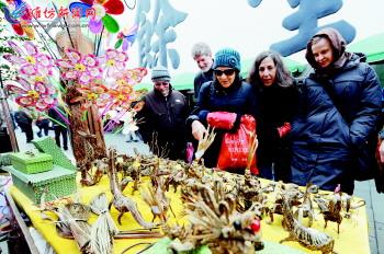 1月2日,几位国外游客被河坊街上用叶子编制的动物玩具吸引。