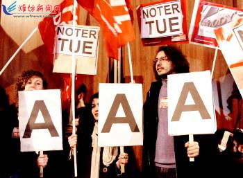 | 1月13日,标普宣布下调法国等多个欧元区国家主权信用评级后,连日来示威者来到标准普尔公司位于法国巴黎的办公室外抗议。 |