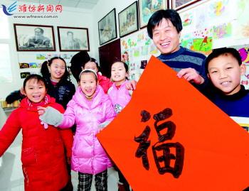 奎文区广文街道虞虹桥社区书法爱好者为邻里送“福”