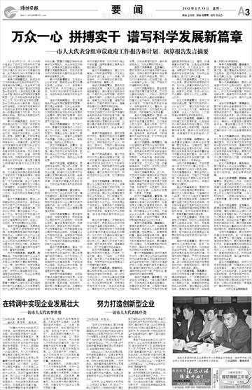 2月10日和11日,市人大代表分组审议了政府工作报告和关于潍坊市2011年国民经济和社会发展计划执行情况与2012年计划草案的报告、关于潍坊市2011年预算执行情况和2012年预算草案的报告。 寒亭代表张爱云说,按照政府工作报告提出的任务目标做好工作,相信潍坊各项事业一定会有突飞猛进的发展,“四个潍坊”建设的宏伟蓝图一定会实现。人民法院担负着化解社会矛盾,维护社会和谐稳定的重要职责,下步,市中级法院将紧紧围绕中心工作,充分调动各方积极因素,在合力调处纠纷化解矛盾、促进社会和谐稳定、加强信用信息等级评价促进社会信用体系建设等方面,进一步健全完善工作机制,充分发挥审判职能,更好地为党委政府工作大局保驾护航。 青州代表杨洪旭说,政府工作报告提出的在八个方面“实现新突破”,很有力度;提出的今年要办好的10件民生实事,充分体现了民生优先、服务为先的理念,必将对统一思想、凝聚力量、引领发展起到积极的作用。我们检察机关要坚持服务中心、保障发展,坚持把关注和保障民生摆在更加突出的位置,紧紧围绕市委“一六四三”的思路目标和任务举措,充分发挥检察机关打击、预防、监督、保护等职能作用,为确保实现政府工作报告提出的目标任务、建设更加富强文明幸福的新潍坊作出应有的贡献。 坊子代表张军说,政府工作报告,无论是总结成绩还是安排部署工作都体现了求真务实精神;围绕建设“四个潍坊”,对“三个转型”作了战略部署,突出了主题和主线;对保障和改善民生工作提出了明确要求,并继续把为民办好10件实事写进了报告,充分体现了以人为本、执政为民的发展理念和服务理念。 奎文代表秦学昌说,要进一步完善全民创业服务平台,紧密结合我市优势产业和特色经济,广泛发动社会各方力量,多渠道征集、开发创业项目,建立涵盖各个行业、各个产业,有市场分析和效益分析的动态“创业项目信息库”,为自主创业者推荐符合实际、投资少、见效快、有市场前景的创业项目。 潍城代表王荣强说,发展特色农业,一要充分挖掘传统优势资源,发展培育具有潍坊传统底蕴的特色农业。二要深化农业产业化经营,通过培育、发展、壮大重点龙头企业和名优品牌带动产业升级。三要充分利用区位优势,发展都市休闲农业。四要注重发挥市场调节作用,遵循市场规律。 坊子代表陈序尧、杨进军、张恒志说,市政府要加强对企业运行的监控分析和协调服务,全面落实支持企业发展的优惠政策和措施,一企一策、结对帮扶。扶持发展金融产业,加强银企合作,推进金融创新,防范和化解金融信贷风险,增强资金投放能力,为企业发展提供充足的资金保证。 寒亭代表蔡沥蒈、孟庆升说,要着力调整产业结构,在巩固加强传统优势产业的基础上,大力发展高科技产业,提升高科技产业在经济格局中的比重。要着力调整区域结构,完善城市发展规划,突出各城区功能定位,统筹各城区基础设施建设。要着力调整要素结构,把经济发展方式切实转变到依靠科技进步和提高劳动者素质上来。 青州代表史春晓说,在促进企业创新方面,要制定出台更加优惠的政策,从资金、人才、信息等方面给予支持,并为加强企业与高校、科研机构的联系交流提供平台,促进科学技术转换为现实生产力。 诸城代表刘树亮说,国土资源是经济社会发展的重要资源要素。要加强土地管理,加快土地流转,搞好挖潜改造,创新用地渠道,最大限度地满足地方经济社会发展的土地需求。要加强矿政管理,保护和合理利用矿产资源,努力建设资源节约型社会。 寿光代表郭锡禄说,在下步工作中,要重视加强高层次人才的引进工作,改变、提高人才知识结构和层次,提高企业核心竞争力。要进一步加大投入,提高产业规模和产品质量。加强企业数字化、智能化改造,推进企业发展壮大。 安丘代表刘全平、王军说,政府工作报告中提出推动工业做大做强,建议市政府出台相关政策,鼓励引导企业加大科技创新和投入力度,全力开拓市场,推动企业快速发展。 高密代表王艳、纪德花说,要坚持依法治税,强化收入征管。进一步优化支出结构,提高公共服务支出比重,新增财力应主要用于社会事业发展和解决民生问题。继续加大对义务教育、公共卫生、社会保障、环境保护等重点领域的投入,加快社会保障体系和救助体系建设。 昌邑代表谭炳禄、田立辉说,要加大对中小企业的扶持力度,建立完善税收、融资等方面的扶持政策。鼓励金融机构创新融资模式,积极开发适合中小企业需求的多种金融产品,进一步拓宽中小企业融资渠道,为促进中小企业健康发展提供帮助。 临朐代表刘文静说,要牢固树立绿色、低碳发展理念,积极实施工业园区和行业环保规划,抓好源头控制,重点发展循环经济、低碳经济项目。要综合利用环保控制、产业政策等手段,把节能降耗与淘汰落后产能结合起来,加强重点企业节能技术改造,全面完成节能减排任务。严厉打击各类环境违法行为,加快推进环保基础设施建设,切实优化生态环境。 昌乐代表李世勇说,建设“四个潍坊”必须以产业转型为基础,加快传统产业改造步伐。要以发展循环经济为理念,加大科技投入力度,发挥人才和科技支撑作用,扎实推动产业向高端发展,不断延伸产业链条,促进企业做大做强,努力为社会提供更多的就业岗位,创造更多的财富价值