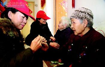 2月27日,在月河社区敬老院,“学雷锋”志愿者在为老人修剪指甲。 当日,潍城区西关街道月河社区“学雷锋”志愿者走进社区敬老院,他们清理院子、打扫卫生,陪老人散步谈心,给孤寡老人送去了温暖的问候和衷心的祝福。 记者王乐摄