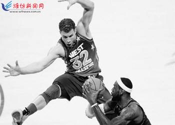 北京时间2月28日,全世界球迷期待的2012年NBA全明星赛在美国奥兰:多市魔术队主场安利中心精彩落幕,经过激烈比拼,最终西部明星队以152比149击败东部明星队,图为西部全明星队球员格里芬(上)在比赛中防守东部全明星队球员詹姆斯。 (新华社发)