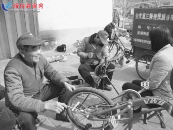 3月1日,在奎文区大虞街道福寿街社区,志愿者正在为居民修理自行车。为促进居民和谐邻里关系,福寿街社区组织志愿者开展便民服务活动,志愿者根据自身特长和技艺,为居民修理自行车、配钥匙……给社区居民送上贴心服务。 记者俞珂摄