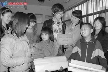 4月12日,在潍坊盲校,大学生志愿者给盲童送上爱心捐款。为了关爱盲童,奉献爱心,潍坊学院外国语学院大学生与潍坊盲校学生结成了对子。多年来,每逢节假日,他们就会来到这里,给盲童送上学习、生活用品,并辅导孩子们学习英语,让他们感受更多的温暖。 记者王晓光 俞珂摄