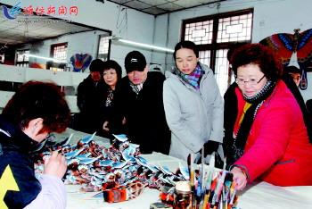 风筝会临近,许多游客提前来到寒亭杨家埠民间艺术大观园,观看体验风筝、年画制作。图为游客正在观看风筝制作。 记者俞珂摄