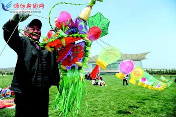 4月17日,为期5天的潍坊风筝大赛在浮烟山风筝放飞场开幕,来自潍坊各地的95支代表队各施绝技,按龙类风筝、板式串类、翅类、软体类等8大类风筝样式,超大、大型、中型、小型等4种风筝形式展开角逐。风筝艺人将代表潍坊各地民俗的内容与风筝放飞艺术巧妙结合起来,像高密四绝、寿光蔬菜、龙头蜈蚣等地方特色都在参赛风筝上得到充分展现。 ▲寿光菜农用各种蔬菜造型扎制的“蔬菜长龙风筝”正在准备放飞。 ◥百米龙头蜈蚣风筝在蓝天飞舞。 记者甄士光 王立军 王乐 实习生聂方超摄