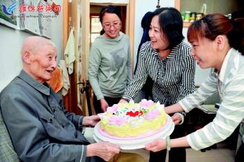 ▲5月9日,奎文区东关街道院校街社区工作人员给丁启公老人(左一)送上生日蛋糕。当日是社区老人丁启公97岁生日,工作人员送来生日蛋糕等慰问品,左邻右舍也送上了各自的祝福。该社区在创建幸福社区工作中,倡导居民争当爱老敬老的爱心使者,把温暖送给身边老人,让文明和谐之风吹遍社区。 记者王晓光摄