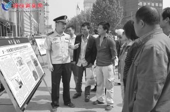5月15日,是全国打击和防范经济犯罪宣传日。当日,奎文公安分局经侦大队开展打击和防范经济犯罪宣传活动,民警通过向群众发放宣传单页、解说图文资料、现场接受群众咨询等方式,增强公众对经济犯罪的认知度,努力营造全民共同参与打击和防范经济犯罪的良好氛围。图为民警向市民讲解如何识破和防范经济犯罪的知识。 记者王乐摄