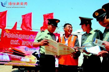 近日,在昌邑饮马镇一施工点,部队官兵正给现场施工人员发放宣传册和报纸。 为进一步加强通信设施、通信线路保护工作,驻潍部队及市公安部门联合开展护线宣传活动。他们沿光缆线路施工点对施工单位及附近居民进行宣传讲解,呼吁大家共同维护通信设施、线路安全。 记者俞珂摄