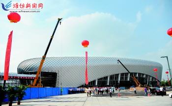 6月27日,蓝天白云下的鲁台会展中心正在进行设备安装。我市大项目鲁台会展中心总投资15亿元,建筑面积12万平方米,由10万平方米的展览中心和2万平方米的会议中心组成。目前主体已完工,现正进行内外装饰、设备安装和外广场铺装,预计7月底竣工,8月份布展。项目完成后,将成为北方对台经贸活动的重要平台、全省对台合作的重要窗口和鲁台经贸洽谈会的永久会址,第十八届鲁台经贸洽谈会将在此举行。 记者王立军摄