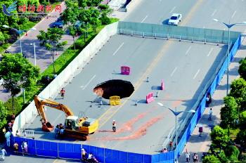 7月5日,湖南省长沙市湘江路中段突然发生塌陷,坑口面积约30平方米,一辆从此路过的轿车被吞没,致1人死亡。事故发生后,长沙消防部门迅速开展救援,交警对该路段实施了临时交通管制。 (新华社发)