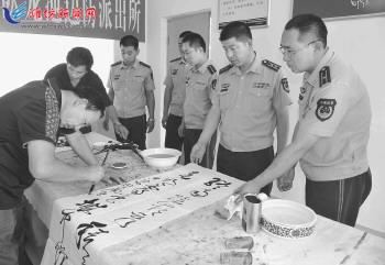 7月30日,“八一”建军节到来之际,我市知名书画家来到昌邑市公安局龙池边防派出所,挥毫泼墨,为边防武警战士送上讴歌军人、讴歌时代的精品力作,共叙军民鱼水深情,受到武警官兵的热烈欢迎。 记者王晓光摄