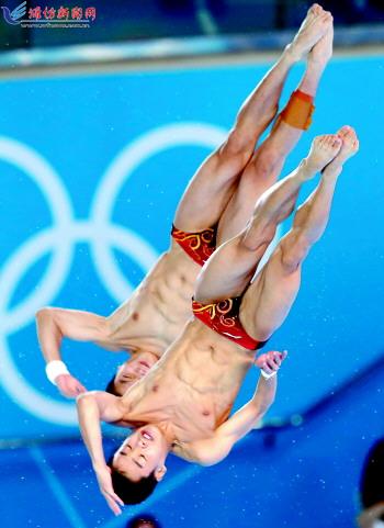 7月30日,在伦敦奥运会男子双人10米跳台跳水决赛中,中国组合曹缘/张雁全以486.78分的总成绩夺冠。 (新华社发)