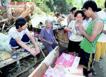 青州、临朐洪灾发生后,全市各级卫生部门迅速派出医护工作者,给群众送来了应急药品,发放到急需使用的受灾群众手中。图为青州市王坟镇一工作人员在为一老大娘发放救灾药品。 记者王立军摄