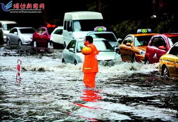 8月9日,一名市政工作人员在积水严重的南京街头值守排水口。据民政部、国家减灾办8月9日16时初步统计,今年第11号台风“海葵”已造成浙江、上海、江苏、安徽4省(直辖市)4人死亡,214.6万人紧急转移。 (新华社发)