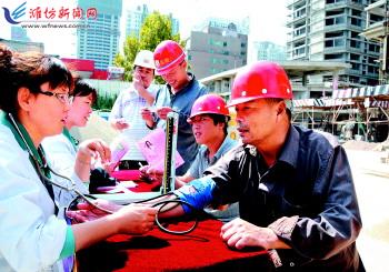 9月19日,在奎文区大虞街道新华路中社区,医护人员正在给工人测量血压。中秋节、国庆节即将来临,该社区邀请门诊医护人员来到辖区工地,免费给忙碌在一线的工人进行身体检查,同时向他们宣传健康保健常识,给他们送上最实惠的节日礼物。 记者俞珂摄