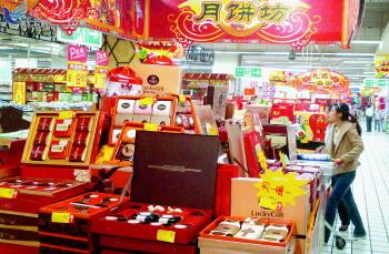 近日,市民在城区一家超市选购月饼。中秋佳节临近,我市各商场、超市都在显著位置摆满了各色月饼。据悉,今年各大月饼生产厂商纷纷推出了月饼新品种,市场上各种口味的数十种月饼受到消费者欢迎,其中中低档月饼的销售尤其红火。 记者王晓光摄