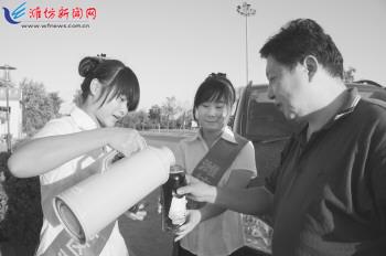 国庆期间,在高速路潍坊北服务站,服务人员给过路旅客倒热水。为给过路旅客提供温馨服务,该站从国庆节开始增设饮水站、医药箱等服务项目,让他们在劳累奔波途中感受一份温暖。 记者俞珂摄