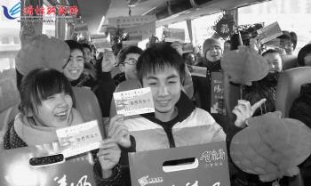 1月18日,“真情潍坊,温暖2013,送百名大学生回家过年”活动在潍坊汽车总站启动,首批30余名贫困大学生坐上交运大巴踏上了回家的路程,潍坊汽车总站为学生们送上了回家的免费车票和灯笼、“福”字等节日礼物。据悉,潍坊汽车总站自2006年启动“送大学生回家过年”活动,8年来已为上千名贫困大学生提供免费乘车服务。 记者王晓光 通讯员董坡摄