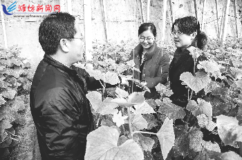 ◥近日,寒亭区开元街道农技站工作人员深入田间地头指导农户高温大棚蔬菜种植。连日来,低温和降雪天气严重影响高温大棚蔬菜的生长,为此该街道专门派出农业科技人员,指导农户进行低温冰冻灾害和病虫害防治,受到农户们的称赞。 记者曹亮华摄