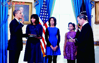 据新华社华盛顿1月20日电 (记者王丰丰 孙浩)美国总统奥巴马20日在白宫举行宣誓仪式,履行法定连任就职程序,开始第二任期。 当天的宣誓仪式在白宫蓝厅举行,由美国最高法院首席法官约翰·罗伯茨主持。奥巴马在罗伯茨带领下,朗诵就职誓言,完成法定程序,开始第二任期。在现场观礼的包括第一夫人米歇尔、奥巴马夫妇的两个女儿等亲友(右图)。 奥巴马四年前就职时,美国正处于自大萧条以来最严重的经济危机之中,作为总统,他最重要的任务是挽狂澜于既倒。四年后,美国经济虽已走出衰退,但是在经济复苏的道路上仍然荆棘遍布,发展缓慢的GDP,居高不下的失业率,不确定的海外市场等等都为美国经济的彻底好转投下层层阴影。在开始新的任期后,奥巴马的首要任务仍然是处理经济问题。 美国宪法规定,奥巴马的第一任期于20日中午结束,他必须在当天履行连任就职程序。由于20日是一些宗教的礼拜日,按照传统,奥巴马的公众就职典礼将于21日举行。届时,奥巴马将再次宣誓,并发表就职演说。他随后将参加游行活动和两场就职舞会。