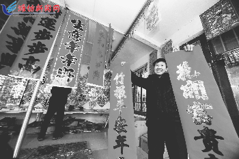 ◥1月23日,高密市夏庄镇东李村的李永杰正在展示春联产品。据了解,该村是远近闻名的“对联村”,有7成家庭参与经营红纸对联。临近春节,村民们紧张忙碌地赶制春联供应市场,到处是一片红红火火的生产场面。该村的大红对联因经雨水、日晒不变色的特殊工艺而深受各地客商青睐,近年来更是采用了染色、印刷、烫金等工艺的流水线生产,生产效率和经济效益大幅提高。 记者曹亮华摄