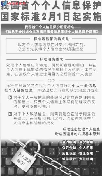 ——指南很有必要,但缺乏威慑 北京邮电大学教授曾建秋认为,指南的出台很及时也很必要,在这个信息爆炸的时代,个人信息往往就意味着财富和资源。这个指南详细规定了相关标准,为下一步针对性打击相关犯罪提供了有力武器。 曾建秋表示,目前,国内信息泄漏主要呈现三大特点,一是泛滥,很多人的信息在本人不知情的情况下被他人盗取或收集,这种情况在以前的美日韩等国也很普遍;二是多发,用户个人泄漏信息领域不断扩大,从电信逐渐扩散至房产、汽车等领域;三是后果越来越严重,不法分子利用所收集的他人信息,疯狂地进行电话、短信诈骗等犯罪活动,而且这种犯罪有跨国作案的趋势。 但业内不少专家指出,由于这个指南仅是一个技术性标准,缺乏对违反这个标准的惩罚性措施,因此对于打击个人信息犯罪尚不具有威慑性。 ——期待个人信息保护尽早立法 中消协律师团团长邱宝昌表示,在我国的个人信息保护法还未出台之前,这个指南具有“准法律性”,能为将来的立法提供借鉴。但是,由于它现在仅是一个“指导性技术文件”,建议国家在这方面尽早立法。 邱宝昌还认为,每个人对信息的敏感度不一样,建议在收集和利用他人信息之前,最好获得个人信息主体的明确授权。 (据新华社) ■ 解读 “最少够用”“个人同意”是原则 《信息安全技术 公共及商用服务信息系统个人信息保护指南》对个人信息保护作出了怎样的规定?其出台对个人信息保护会起到什么作用?带着这些问题,记者采访了参与起草《指南》的中国软件评测中心副主任朱璇。 □管理和技术双管齐下 问:当前个人信息泄露事件频发,信息服务从业者在处理公民个人信息过程中,主要在哪些环节出现了问题? 答:目前,许多企业在个人信息处理过程中保护措施还存在不足,在个人信息收集、加工、转移、删除各个阶段都可能存在一些问题。因此,只有参照《指南》对个人信息处理的各个阶段进行梳理,规范企业行为,才能有效减少个人信息泄露事件的发生。个人信息保护要从管理和技术两方面双管齐下,个人信息管理者应制定完善的个人信息保护管理制度,同时在技术上采取必要的安全保障手段。 □八项原则哪些涉及较多 问:《指南》确立了“目的明确、最少够用、公开告知、个人同意、质量保证、安全保障、诚信履行、责任明确”八项原则,规范信息服务从业者的行为。在公民个人信息的使用和处理过程中,涉及比较多的是哪些原则? 答:从目前已发生的个人信息相关安全事件来说,比较多的涉及“目的明确”、“最少够用”、“公开告知”、“个人同意”等原则。例如智能手机上的某些软件,在收集手机用户个人信息的时候,并没有明确告知主体收集相关个人信息的目的,即违反了“目的明确”和“公开告知”原则。中国软件评测中心出具的《2012年Android手机软件个人信息安全测评报告》显示大量手机软件会自动收集用户的IMEI号、上传用户通讯录等,违背了“个人同意”原则或“公开告知”原则。 □选择合适企业开展试点 问:《指南》属于技术指导文件,不具有强制执行力,有人质疑此举意义不大,您认为其出台的最大意义是什么?未来,又将通过哪些后续措施,促进其“落地”? 答:作为第一部个人信息保护相关的国家标准,《指南》可以说是我国个人信息保护工作的一个里程碑。《指南》适用于指导除政府机关等行使公共管理职责的机构以外的各类组织和机构,我们可根据具体国情,开展“标准先行”,在《指南》的基础上促进行业自律、企业自律,有效地推动我国个人信息保护立法进程。未来,我们计划选择合适的企业,导入个人信息保护国家标准实施试点工作。 (据新华社)