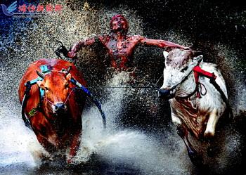 | 体育类单张一等奖。摄影师:Wei Seng Chen 当地时间2012年2月12日,印尼Batu Sangkar,在收获季节结束时,公牛赛跑的参赛者脚踩拴在两头牛中间的马具上,拽着牛尾巴比赛,一名选手冲到终点时流露出喜悦之情。 |  |