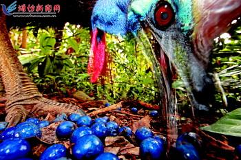 | 自然类单张一等奖。摄影师:Christian Ziegler 当地时间2012年11月16日,濒临灭绝的双垂鹤驼在吃檀香科树木上的果实。 |  |