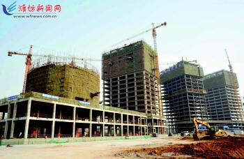 寿光企业总部群项目是潍坊市100个服务业发展重点项目之一,总进驻企业55家,设计建筑23栋,建筑面积92.4万平方米。项目意在把寿光市内成规模的大中企业的管理办公机构集中在一起,发展总部经济,实现企业综合效率和城市产业形象并举的发展目标。近年来,寿光加快服务业发展步伐,通过实施“服务业五大工程”,力促该市经济转型升级。图为寿光企业总部群项目施工现场。 记者王晓光摄