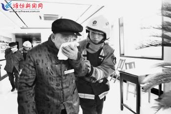 3月22日,高新区敬老院的老人们在消防战士的帮助下练习火灾逃生。当日,高新消防大队的消防官兵来到敬老院,为生活在那里的85名五保老人和敬老院的工作人员讲解火场逃生技巧,提高老人们的自救能力。 记者孙树宝摄