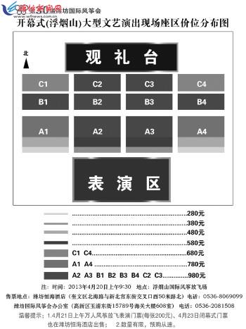 注:时间:2013年4月20日上午9:30 地点:浮烟山国际风筝放飞场 售票地点:潍坊恒海酒店(奎文区北海路与新北宫东街交叉口西50米路北) 电话:0536-8069099 潍坊国际风筝会办公室(高新区玉清东街15789号海关大楼608室) 电话:0536-2081508
