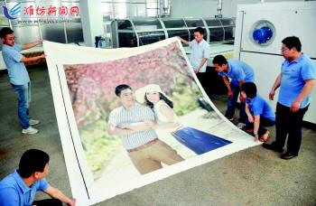 5月24日,技术人员在查看数码喷墨印花机的打印效果。高密孚日集团子公司梦圆家居公司日前投资50万欧元从意大利购进了数码喷墨印花机,这是目前世界上技术最先进、最具有工业级产能的数码印花设备。该项目投产以来,凭借高精密度的印花像素以及先进的个性设计理念,成功实现山水风景图案、个人照片等的精彩印制,满足了人们对多品种、个性化纺织品的需求。 记者王晓光 通讯员王有志 王翔摄