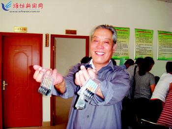 5月25日,对奎文区潍州路街道道口社区因城中村改造而拆迁的145户居民来说是值得纪念的一天,因为在这一天他们领取了最后一段时间的拆迁补助金,同时领到了新房的钥匙。该社区的城中村改造工程开始于2010年10月份,历时两年多的时间全部完成。图为一位回迁户向记者展示新房钥匙。 记者王金 通讯员许小静摄