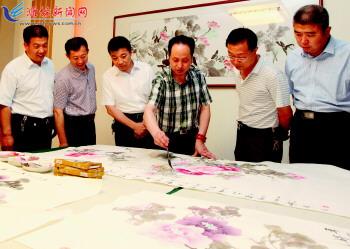 “巧手收拾震后家,一星灯火照繁华。五年共忆西窗月,喜见北川披彩霞。”五年前的5月29日,是昌邑市住房和建设局支援汶川地震灾区服务队出征的日子。为表达对建设者们的崇敬之情,5月29日,甘肃省慈善总会理事、青年画家郑飞钰来到昌邑,为该局参加汶川地震灾区援建的建设者捐赠国画作品十余幅,以此感谢建设者们的无私奉献。图为画家在创作国画《盛世和谐》。 记者甄士光摄
